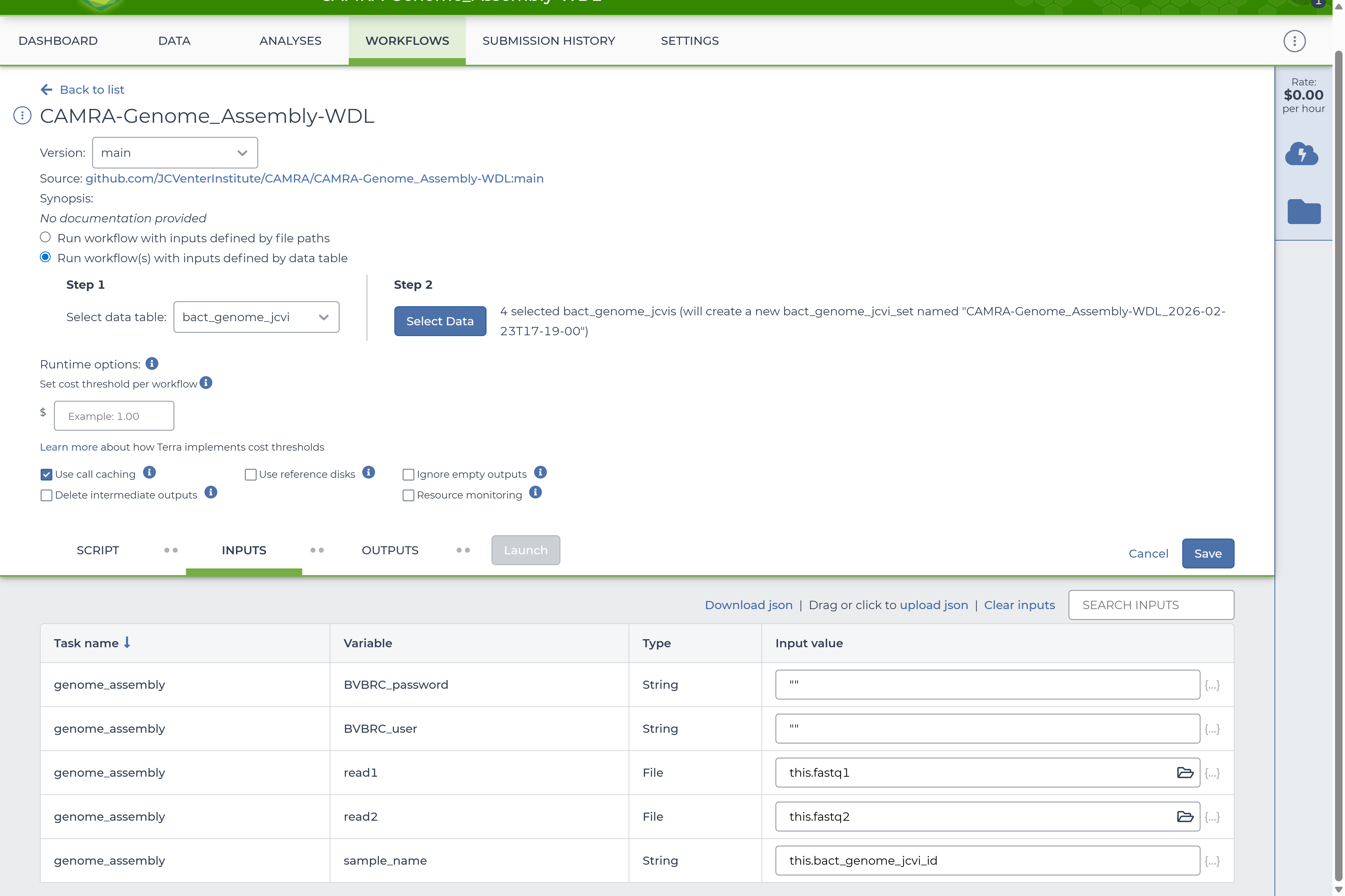 Once a workflow is open in Terra, select the data you will analyze and define the input parameters. Some tasks, such as genome assembly, require a BV-BRC account username and password.