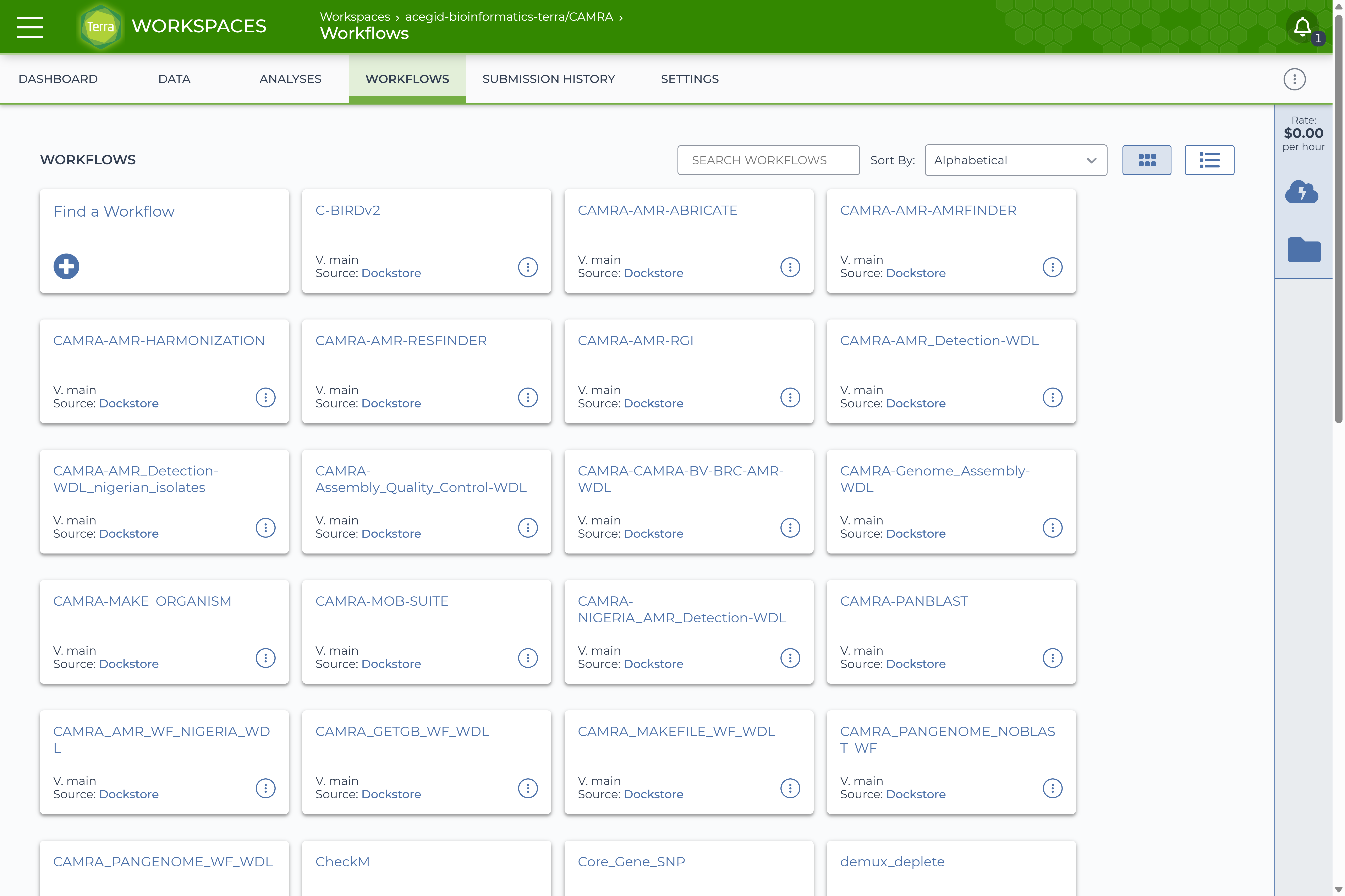 Because cAMRah was built using WDL and containerized tools, it is well suited for the terra.bio platform. Terra is a collaborative project between the Broad Institute, Microsoft, and Verily. Terra.bio makes organizing your samples and analyses easy.