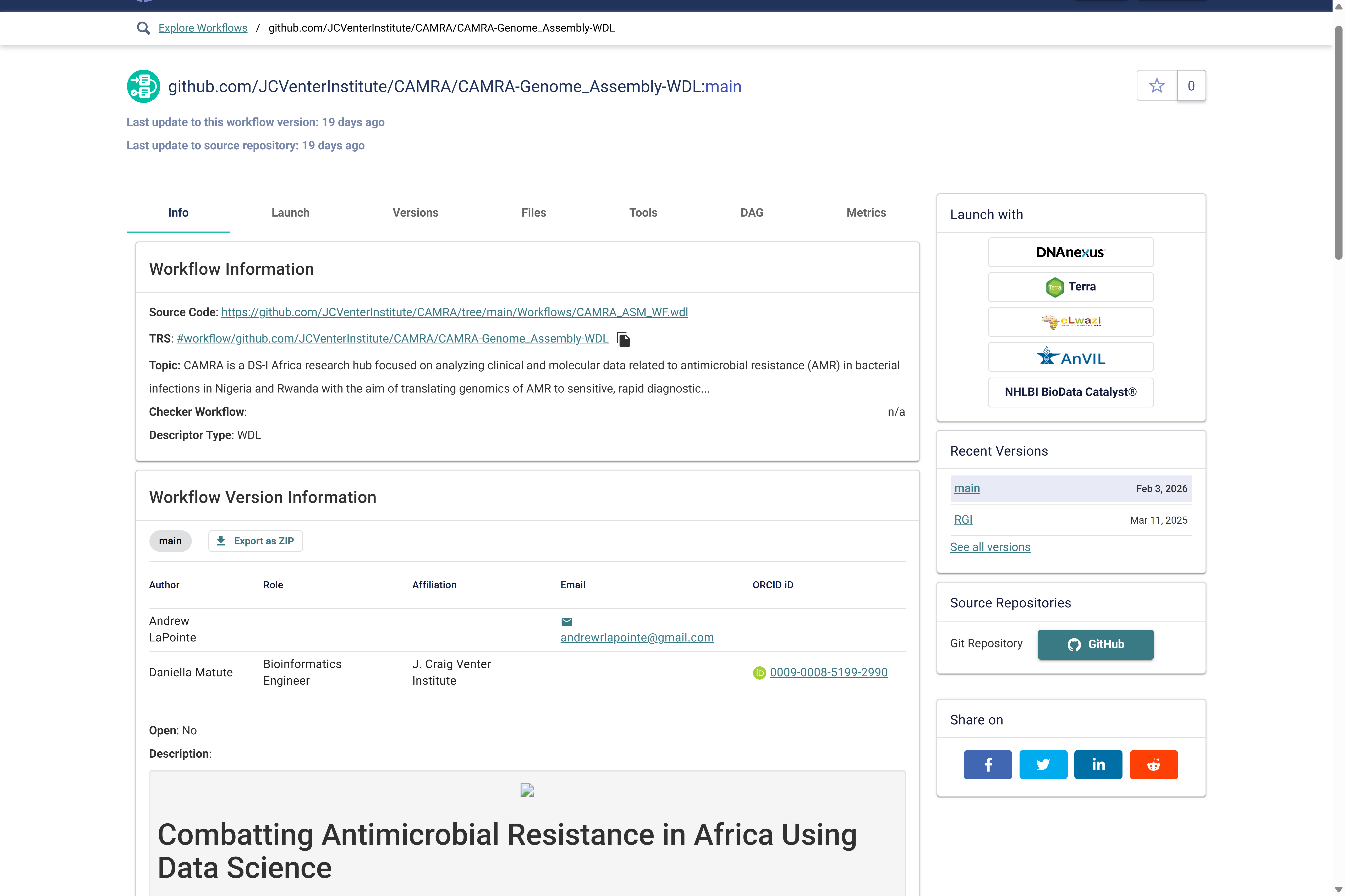 On Dockstore, search for "JCVenterInstitute/CAMRA" to see all our available workflows. Once you have found the workflow you need, select Terra under the launch options.